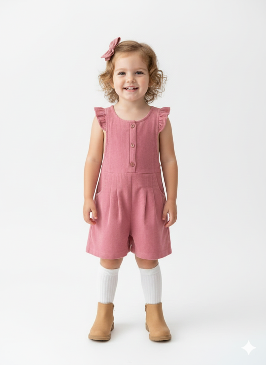 Designed for both play and pictures, this charming dusty rose dungaree is crafted from a soft, premium ribbed knit that offers both comfort and durability. The design features elegant flutter sleeves and classic front-button detailing, blending a vintage aesthetic with a modern, easy-to-wear silhouette. Finished with practical side pockets and a relaxed fit, it’s the perfect one-piece for a stylish, adventure-filled day.