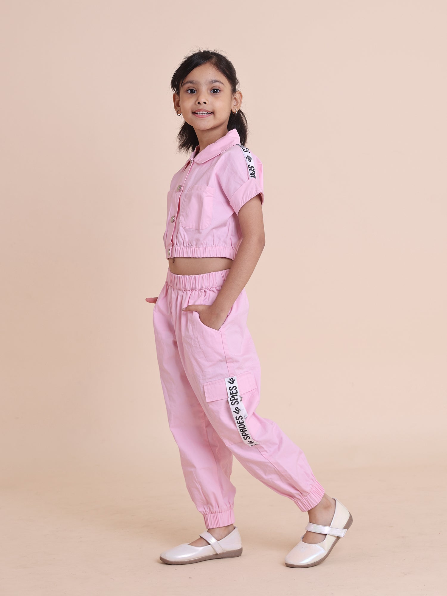 Introduce her to bold, stylish playwear with this vibrant two-piece utility cargo co-ord set. Featuring a short-sleeved cropped shirt with functional pockets and stylish buttons, this set also includes elasticated jogger-style pants adorned with cool strap details. Perfect for girls who love to move, this ensemble combines practicality and fashion, making it ideal for both casual outings and playful adventures. Available in fun colors like lime green and blush pink.